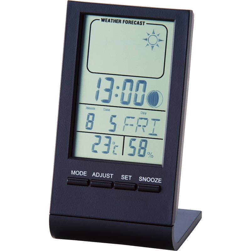 天気予報の機能も付いたコンパクトな温湿度計付多機能デスククロックです。月の満ち欠けも分かるムーンフェーズ機能付。・時計・アラーム・スヌーズ・カレンダー・温度計・湿度計・天気予報・ムーンフェーズ