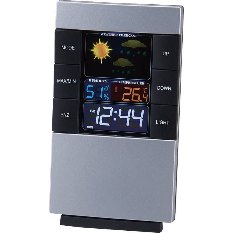 これからの天気予報や温度、湿度がカラー表示される見やすい多機能時計です。音・振動センサー付でバックライトが自動点灯。・時計・アラーム・スヌーズ・温度計・湿度計・天気予報・カレンダー・バックライト・音・振動センサー